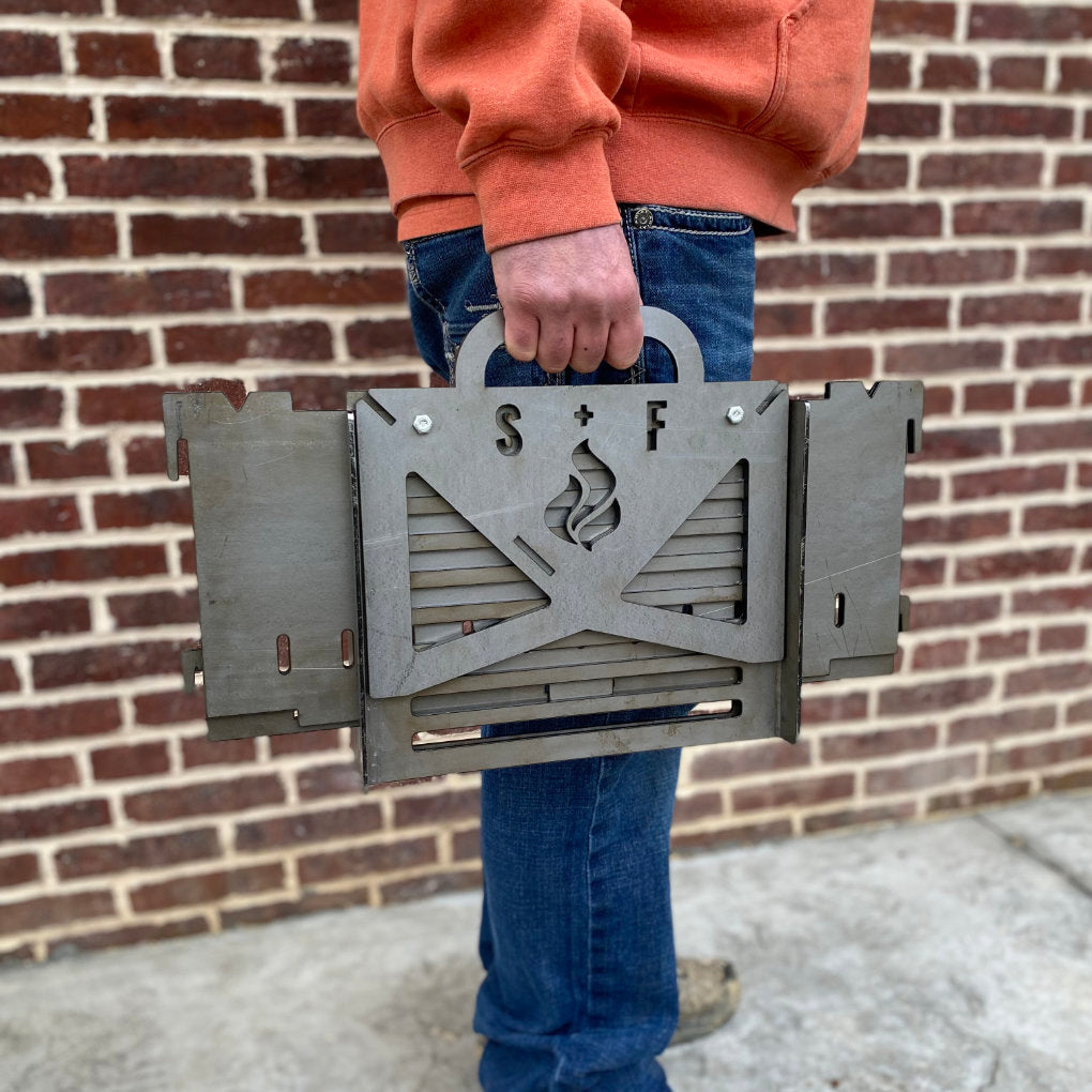 10-gauge carbon steel. Laser-cut precision. Slots together fast. Collapses flat for transport. Note: griddle does not flat pack.